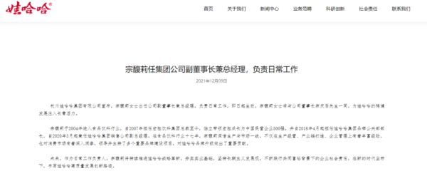 12月9日,娃哈哈集团在官网发布新闻,宣布宗馥莉出任集团副董事长兼总经理,负责日常工作,“与宗庆后一同,为娃哈哈的稳健发展注入长青活力”。其父宗庆后仍为集团董事长。
