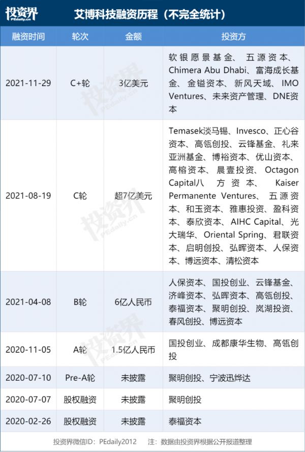 最近的一笔融资是在上周——11月29日,苏州艾博生物科技有限公司(以下简称“艾博生物”)完成了3亿美元C+轮融资,由软银愿景基金联合老股东五源资本共同领投,Chimera Abu Dhabi、富海成长基金、金镒资本、新风天域、IMO Ventures、未来资产集团、DNE资本等跟投。而此前在8月19日,这家公司才完成超7亿美元(45亿人民币)的C轮融资,创下中国生物医药企业上市前单笔融资金额最高纪录。