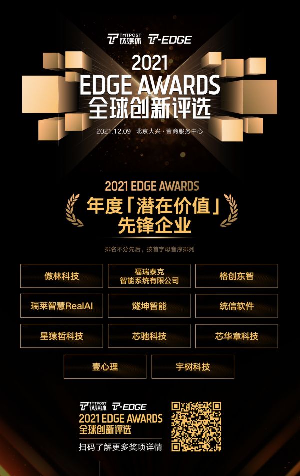 钛媒体 2021 EDGE AWARDS全球创新评选之 「EDGE AWARDS 年度潜在价值先锋企业」榜单正式揭晓,获奖企业包括:傲林科技、福瑞泰克智能系统有限公司、格创东智、瑞莱智慧RealAI、燧坤智能、统信软件、星猿哲科技、芯驰科技、芯华章科技、壹心理和宇树科技。