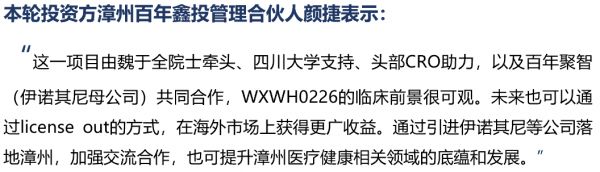 在专利方面,WXWH0226的化合物专利、晶型专利皆归属于伊诺其尼公司。其中,化合物已获得中国大陆的专利授权,正在开展美国、日本、欧盟等地区专利申请;晶型专利也正在审核过程中。