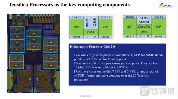 具体剖析下来,这颗将近80平方毫米的芯片,一大半面积就是HPU,包括大规模向量浮点处理单元和定点处理单元两类,一共加起来是基于26个Tensilica处理器的>1TOP的可编程计算能力,以增加扩展指令的方式,提升性能需求。