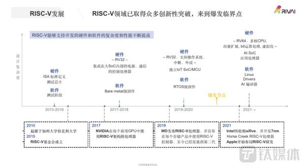 RISC-V大概发展了十年,从最早定义这一家精简指令集,十年间经过了芯片定义、软件测试和MCU级别处理器广泛应用,以及到现在使用在更多AI和更复杂的处理器当中,来到了爆发临界点。