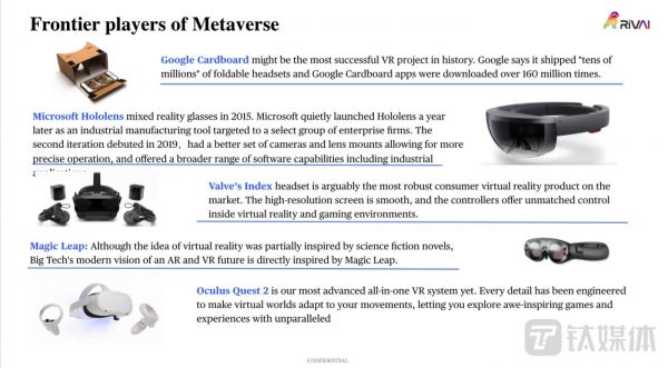 说到“元宇宙”,其实已经发展相当一段时间。我列了几个公司和产品,比如,早期的Google Cardboard,你可以用手机进行VR体验,这是比较原始VR的配置;再比如,微软公司推出的HoloLens产品;小公司Valve有自己产品;而Oculus后来被Meta收购,是扎克伯格的“元宇宙”中非常重要的组成部分;另一个大玩家苹果公司,则有望在明年看到他们的革命性产品。