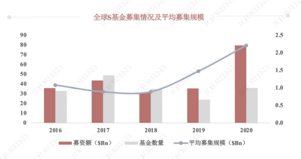 2020年全球S基金募集规模创下有史以来最高纪录,同比2019年增长超过120%。募集基金数量与前几年相比基本保持同一水平,但单支基金的募资额有了大幅提升,巨型基金成为趋势,拉动了募资规模的急剧扩张。2021年这种趋势有望延续,年初,科勒资本完成了其最大的一只S基金募集,规模为90亿美元。