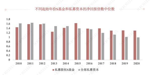 设立年份在2015年以前的S基金,净回报倍数低于整个私募资本类别(包括风险投资基金,私募股权基金,私募债,房地产、基础设施建设、自然资源投资基金等)。从2015年起,S基金的短期优势开始凸显出来,且近几年一直表现优异,而私募资本的整体回报水平呈逐年下降的趋势。