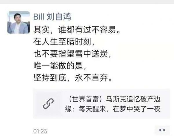12月9日凌晨1点23分,刘自鸿在转发一篇“马斯克追忆破产边缘”文章时,发出如下感慨,“其实,谁都有过不容易。在人生至暗时刻,也不要指望雪中送炭,唯一能做的是,坚持到底,永不言弃”。