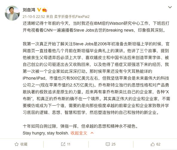 今年10月5日,刘自鸿回忆起十年前的同一天,除了在IBM纽约Watson研究中心的工作,印象极其深刻的莫过于乔布斯的去世。