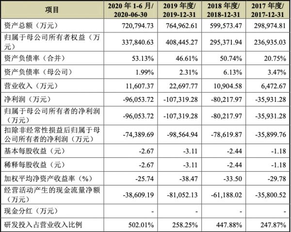 招股书显示,2017年、2018年、2019年和2020年1-6月,柔宇科技营业收入分别为6472.67万元、10904.58万元、22697.77万元和11607.37万元,总计约5.17亿元。