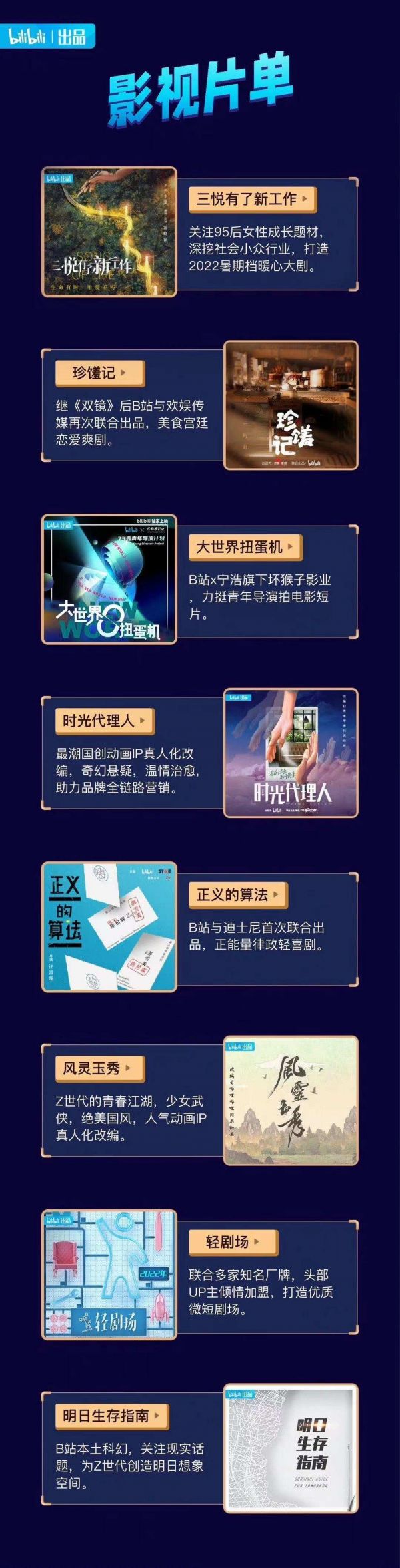 B站公布了包括大型演出活动、综艺、国创、纪录片、影视、直播和运营活动等在内的6大类、共计74项精品内容项目,并开启招商推介。