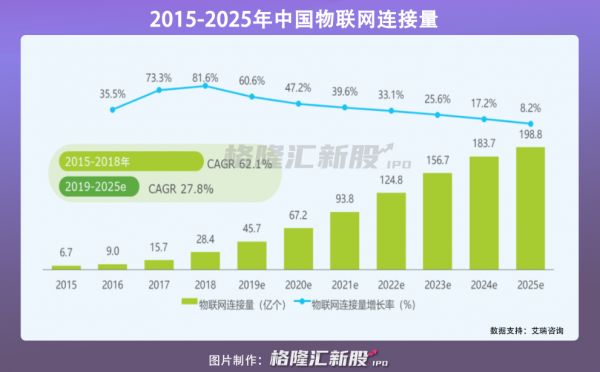 在资本市场热度不断、新兴企业抢滩布局的大背景下,中国物联网连接量一路高歌猛进,从2015年的6.7亿连接量增长至2018年的28.4亿,年均复合增长率达62.1%,预计到2025年将达198.8亿。