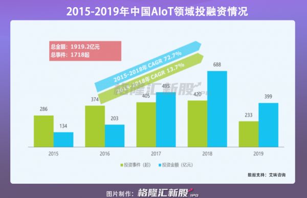 2015年至2019年,AIoT赛道共发生投融资事件1718起,总融资额达到1919亿元。
