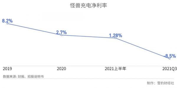 今年三季度,怪兽充电的成本与费用同比增长25.8%至10.1亿元,其中销售与市场费用同比增长23.8%至8.14亿元,占其总营收的87.5%。2019年、2020年和2021年上半年,怪兽充电净利率分别为8.2%、2.7%、1.28%,今年三季度净利率为-8.5%。