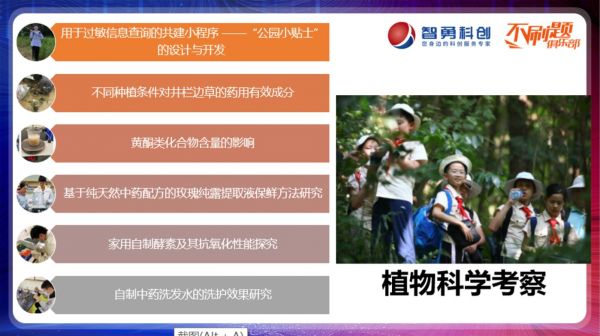 我们一直有个说法叫打破教室的墙、离开学校的栏、用脚步丈量世界。我们2014年跟教师上山,进行全天10小时在山上非常严酷科学实验考察,没有一分钟参观、旅游的行为。在这个过程中,很多孩子对昆虫、土壤感兴趣,很多孩子环保意识非常强,回到家里发生了很多变化,很多孩子会用先进人工智能技术为野外科学家们提供各种各样的创意和发明,很感动。这里我列了孩子们科考过程中做的课题研究(见下图),可以看到非常有趣,不是单一野外,相当于把生物、环境跟化学、物理所融合的跨学科的科创成果。