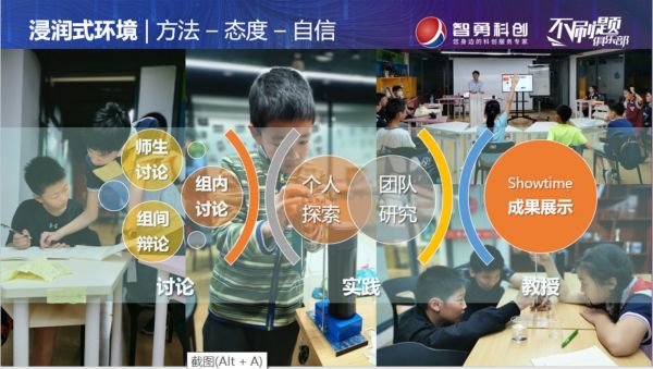 在这样的背景下,我们的模式也非常清晰了。刚才说教方面、培养态度最终建立自信、培养目标我们要有整个形势,这张图(下图)可以看到我们的场景,通过分组、讨论,包括设置无数个跟生活中相近的,相对来说比较低结构的场景,这里给大家解释一下为什么会原则低结构引入手段,因为跟生活够近,我们想告诉孩子们创新不是一定要等到大学、一定要等到工作才可以创新,我们身边生活、玩具、生活中小例子和现象都是可以让我们进行创新的一些源泉,只要我们善于去观察,保持好奇心,又愿意去行动,我们都可以。
