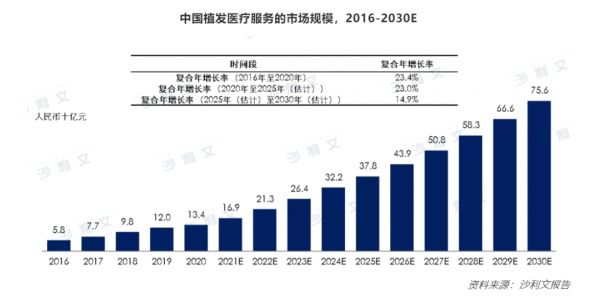 据全球咨询公司Frost&Sullivan(弗若斯特沙利文)的数据,2020年在中国进行的植发手术约为51.6万例,市场规模134亿元,渗透率为0.21%,市场需求远未得到满足。2021年,植发的市场规模为169亿元,预计到2025年将达到378亿元,复合年增长率23%。
