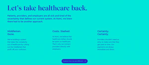 “讽刺的是,雇主支付的医疗费用到保险公司手上,折算各类费用后再支付给医疗机构,这一过程扣除的中间商费用占最初支付金额的30%到40%。而「Nomi Health」致力于创立一种新方法,鼓励患者自筹,并提供医疗服务的购买和支付平台。” Newman在采访中表示。