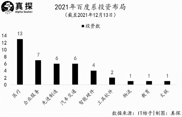 从具体投资领域来看,百度投资版图中有四分之一以上都是医疗企业,13家。百度还投了7家企业服务公司,6家先进制造和6家汽车交通。此外,百度的投资触角也伸到了智能硬件、工具软件、文娱、教育等领域。