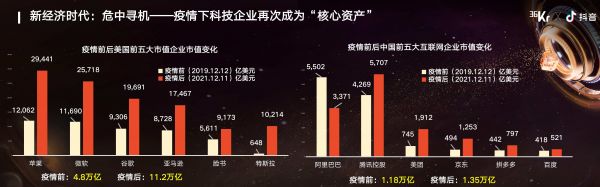 第三,疫情下科技企业再次成为“核心资产”。但还有一个现象值得我们反思,这张图反映了疫情前后中国美国前五大互联网企业的变化。疫情之后中国前五大互联网企业的市值是美国前五大的十分之一。
