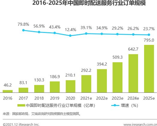即时配送实际上高速增长也就在近5年。艾瑞咨询研究院测算,即时配送服务行业的年订单量从 2016 年的 46 亿单增至 2020 年的 210 亿单,复合年增长率为 46.0%,并预测到 2025 年将增至 795 亿单。其中预计2024年第三方即时配送服务行业年订单量将进一步增加至163亿。