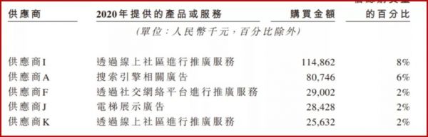 雍禾医疗的招股书中还提到,2020年其主要的5大供应商均为广告服务提供商,其中最大一笔线上社区推广服务商采购金额达到了1.15亿元。而雍禾医疗所采购的产品或服务,覆盖了线上社区推广、搜索引擎广告和电梯展示广告等。