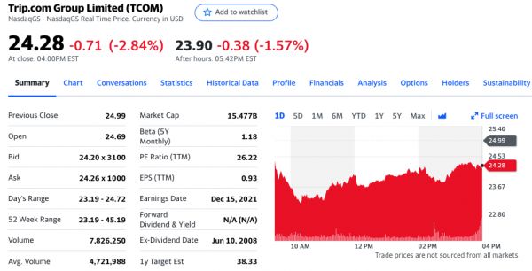 携程周三在纳斯达克交易所的开盘价为24.69美元。截至周三收盘,携程股价下跌0.71美元,报收于24.28美元,跌幅为2.84%。截至美国东部时间周三17:42分(北京时间周四6:42分),携程股价在盘后交易中下跌0.38美元至23.90美元,跌幅为1.57%。过去52周,携程股价最高为45.19美元,最低为23.19美元。