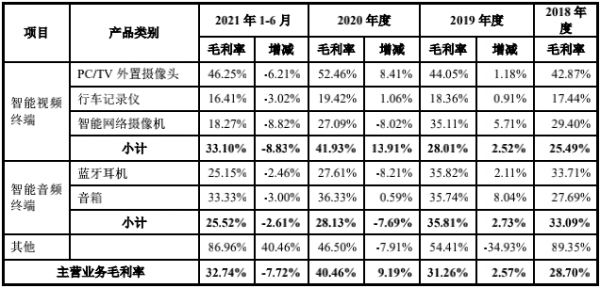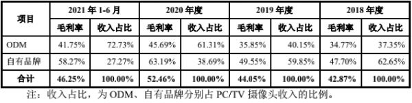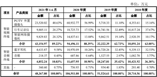 根据披露,奥尼电子的智能视频终端包括了PC/TV外置摄像头、行车记录仪、智能网络摄像机,就收入变动来看,PC/TV外置摄像头业务的放量是刺激公司整体收入爆发的最主要因素。期内,公司的PC/TV外置摄像头业务的收入由2018年的4353.61万元暴增至2020年的6.09亿元,占比亦水涨船高由15.16%提升至56.99%。