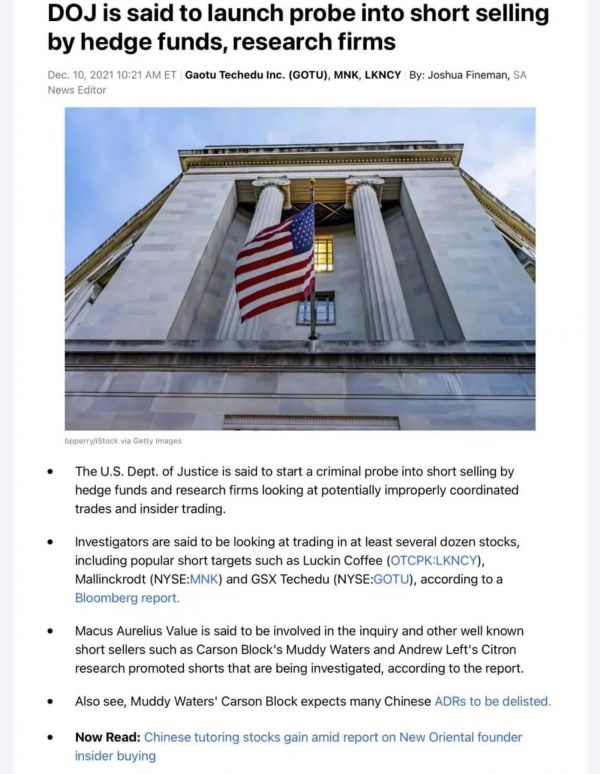 也许用不了多久,真相就会浮现。12月10日,据媒体报道,美国司法部已对对冲基金和研究公司的做空行为展开了刑事调查,司法部将仔细检查这些机构间的关系,寻找是否存在不当交易或违反其他法律以获利的迹象。美国当局的律师正试图确定卖空者是否参与了某种形式的欺骗,例如,通过误导公众以策划股票暴跌以引起股东恐慌并加剧抛售。