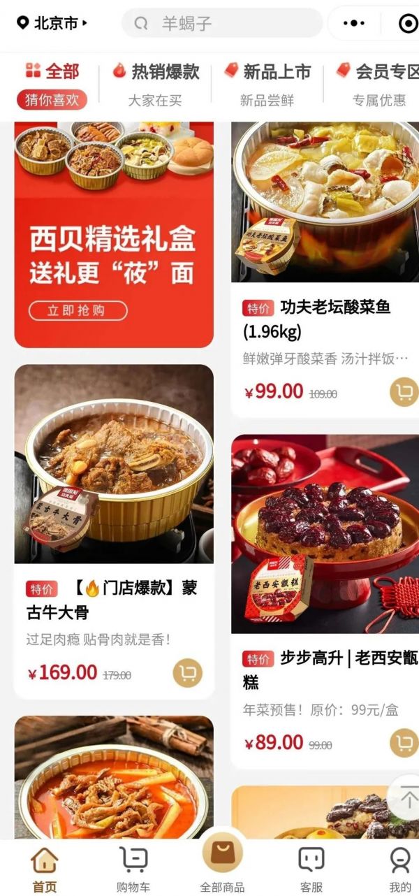 海底捞推出了半成品菜“开饭了”系列,在各大电商平台和其app上架了酸菜鱼、辣子鸡丁、宫保虾球等菜品;云海肴把微信作为主战场,上线了“云海肴菜篮”和“舔鼻尖货栈”两个小程序商城,售卖新鲜蔬菜、半成菜品等;西贝也在其微信小程序“西贝甄选商城”开售草原羊蝎子、蒙古牛大骨、功夫老坛酸菜等预制菜。
