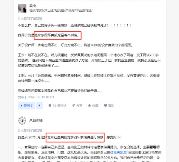比如在某问答平台,有消费者就对北京四环美凯龙至尊Mall店进行到了评价,从设计到工期,好一顿吐槽。此外,全国其他城市如上海、深圳等地的消费者也有反馈各种问题。