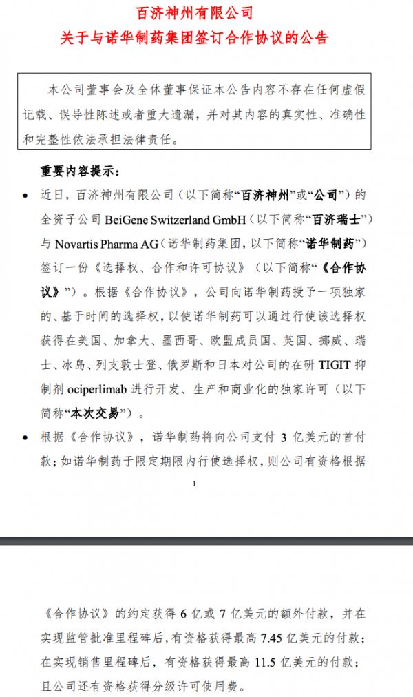 2021年12月20日晚间,百济神州发布公告,公司与诺华达成合作协议,公司向诺华制药授予一项独家、基于时间的选择权的协议。诺华将获得百济神州TIGIT抗体的美国、加拿大、欧洲多国及日本的权益,诺华将支付3亿美元预付款,6亿美元或7亿美元的额外付款,18.95亿美元里程碑(包括:实现监管批准里程碑后,有资格获得最高7.45亿美元的付款;在实现销售里程碑后,有资格获得最高11.5亿美元的付款);以及20-25%的销售分成。