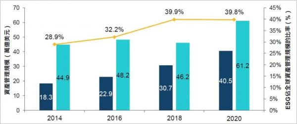 根据港交所之前给出的数据,2014年,全球ESG投资的资管规模为18.3万亿美元,到2020年,这一数据已经增长至40.5万亿美元,涨幅高达122%。作为对比,其他类别投资的涨幅仅为36%。