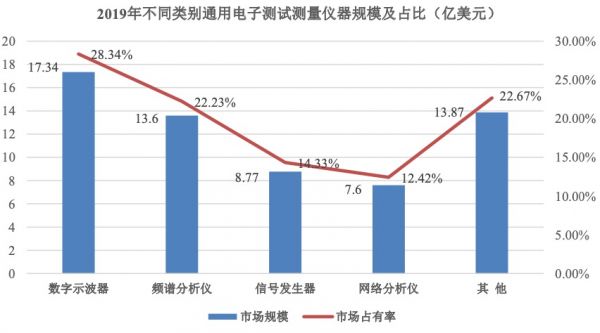 从具体产品来看,数字示波器和频谱分析仪是细分产品中最重要的两类产品,在通用电子测试测量仪器中的比重达到20%以上。根据Technavio的统计数据,细分产品2019年的市场规模和市场占用率情况如下: