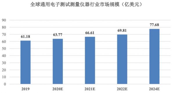 随着全球信息技术发展、电子测量仪器仪表应用领域的不断扩大及5G、半导体、人工智能、新能源、航空航天和国防等行业驱动,全球电子测试测量仪器仪表市场将保持稳定增长。根据Technavio的数据显示,2019 年全球通用电子测试测量行业的市场规模为61.18 亿美元,预计在2024年市场规模达到77.68亿美元,期间年均复合增长率将保持在4.89%。