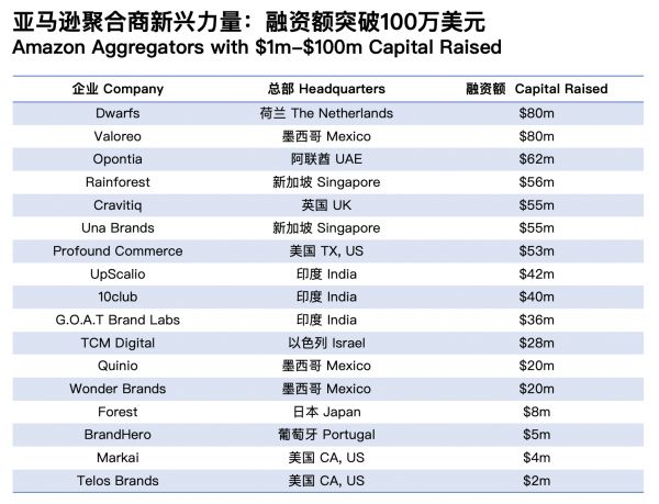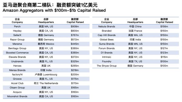 按照融资额体量,亚马逊聚合商目前可以被大致分为以下三个梯度: