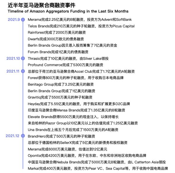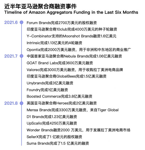 国内市场,首家亚马逊聚合商 Nebula Brands 已于今年 12 月完成 5000 万美金的 B 轮融资,由专注于消费行业的全球知名机构 L Catterton 领投,融资额用于持续收购亚马逊上的中国品牌。