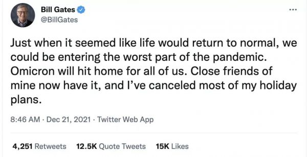 微软创始人比尔·盖茨也因为 Omicron 的传播取消了他的节日计划,并预言“我们可能正在进入疫情最坏的阶段”。但同时,他也乐观表示,只要我们采取了正确的措施,有望在2022年结束疫情。