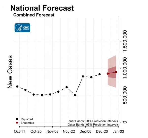 图 | CDC 统计的美国新冠感染曲线与未来预测