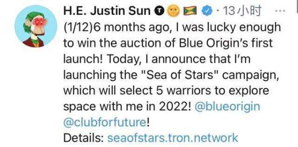12月22日,波场TRON创始人孙宇晨在推特上发文自爆:“6个月前,我非常幸运地拍下了Blue Origin首航的拍卖,2022年将会选出5名勇士和我一起探索太空。”