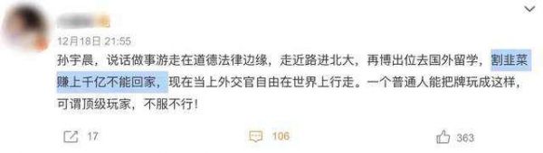 在孙宇晨拍下巴菲特午餐后,一张王思聪的朋友圈截图在网络流传,是王思聪转发一则“孙宇晨拍下巴菲特午餐,桌上全是韭菜”的新闻,并且配文“这不就是个傻X”。孙宇晨也不示弱,发博怒斥“靠爹的还敢骂靠自己的”。