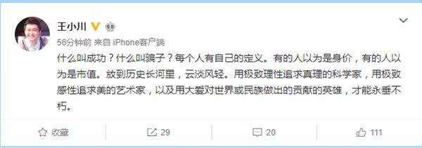 就在孙宇晨拍下巴菲特午餐之后,王小川在微博发文表示,“什么叫成功?什么叫骗子?有的人以为是身价,有的人以为是市值。放到历史长河里,云淡风轻。”