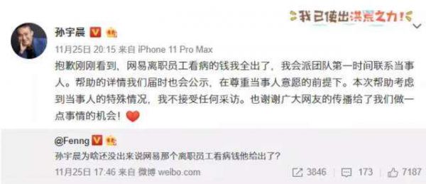 同年11月,当网易患病员工被裁员事件引起网络热议的时候,开始有网友@孙宇晨,“怎么还不出来说他出了这个钱?”