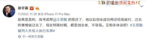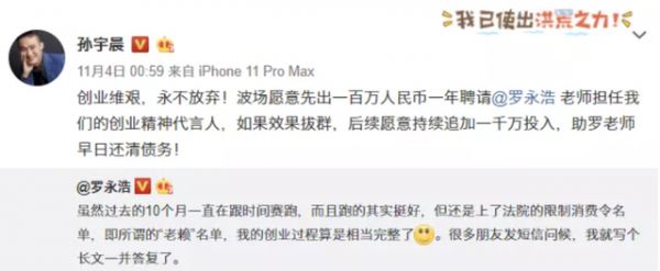 在罗永浩被列入失信名单成为“老赖”后,孙宇晨再次发博表示,愿意花100万元聘请罗永浩担任精神代言人,同时愿意追加1000万元帮助罗永浩还债。甚至在曾经怒怼他“傻逼”的王思聪深陷困境之时,孙宇晨也跳出来表示考虑帮王思聪把债还了。