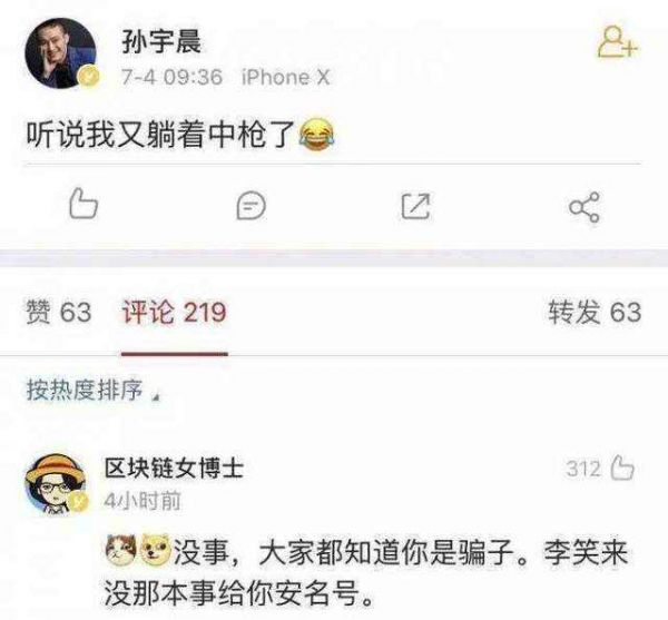 孙宇晨的行径引得有着“中国比特币首富”之称的李笑来都看不下去了。2018年7月,李笑来一则谈话录音曝光,里面揭露了币圈大佬的骗局伎俩,也由此引来孙宇晨发博回应,表示“听说我又躺枪了。”有网友在其评论区写到:“没事儿,大家都知道你是骗子,李笑来没那本事给你安名号”。