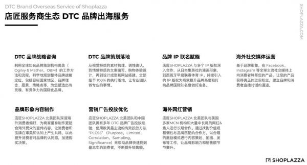 在店匠科技联合创始人陈志浩看来,DTC的核心还是打通“人、货、场”,更好地为消费者创造价值,并抓住机遇推进数字化转型。显然,店匠科技也在向此发力,除了提供建站技术和品牌、营销、运营解决方案外,还可以专门为中国企业和消费品品牌拓展国际化业务提供解决方案与服务。值得一提的是,店匠科技在DTC品牌上与业内顶尖品牌营销服务商达成战略合作,布局了战略咨询、品牌IP联名、形象内容制作等方向。