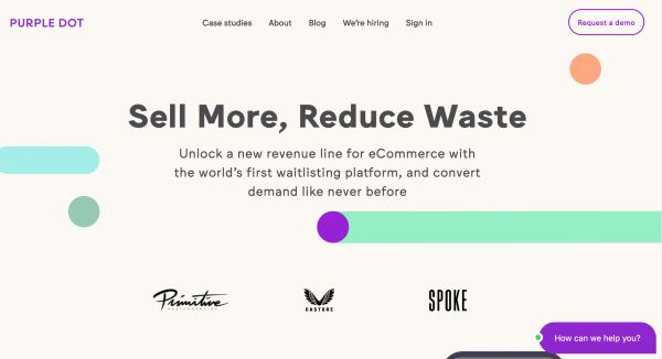 Purple Dot公司于2019年由企业家玛德琳•帕拉(Madeline Parra)和约翰•塔尔博特(John Talbott)创立。Purlple Dot表示,它让电子商务企业能够提前出售库存,从而实现销售最大化,建立品牌忠诚度,并提前获取需求数据。Purple Dot的候选名单解决方案允许库存在到达仓库之前出售。这家初创公司声称,这是市场上同类产品的唯一解决方案。