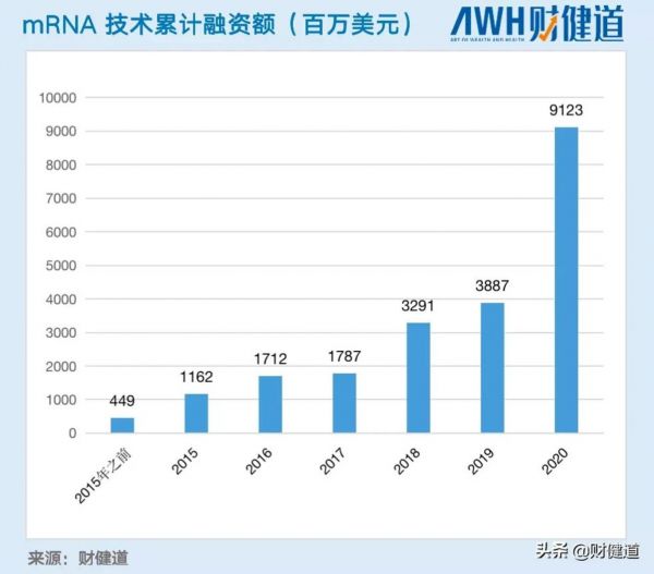 2020年之前,mRNA疗法受到的关注度并不高,2015年之前累计融资4.5亿美元左右,2019年仅为38.9亿美元,而2020年则高达为91.2亿美元。