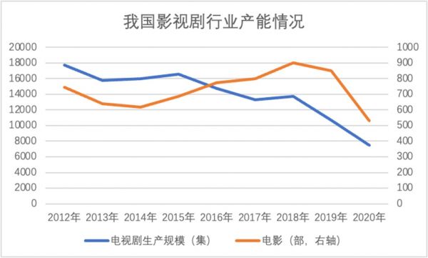 与大多数认为的“疫情原因使得行业产能下降”这种主观看法略有不同,在过去将近十年时间里,我国影视剧其实遭遇了一个较为跌宕的过程,其中电视剧行业的产能呈直线下降,而电影的产能则在2018年后面临较强的回调压力。