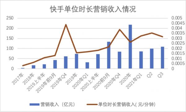 在商业模式中,快手近年来也进行了较大的调整,主要表现在由早期直播为主,逐渐放大了营销收入占比,由于有运营侧重点的改变,我们对用户价值(也就是营销价值)的描述就无法用常态的ARPU来表示,而是将用总营销收入除以总时长(DAU*当期用户每天时长*总天数),来看单位时长的营销转化情况,见下图: