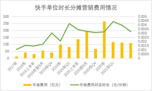 2.假设快手是一家流量运营公司,市场费用主要目标为获取流量,那么市场费用摊薄在单位时长的单位成本,就可视为成本的控制能力。