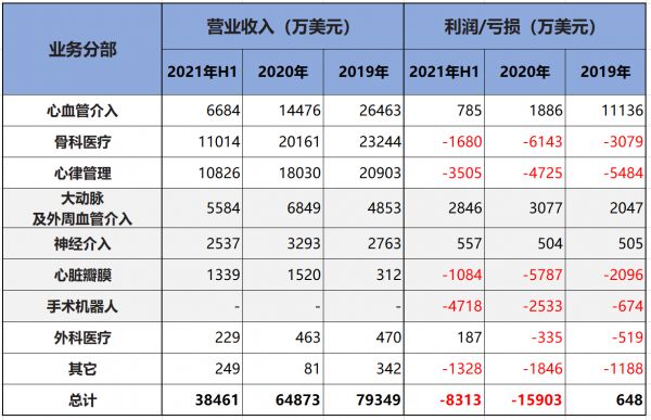 2019年-2021年H1微创医疗分部业绩表,来源:年报,36氪整理